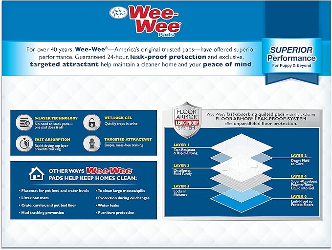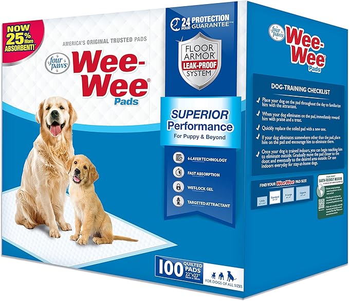 Four Paws Wee-Wee Superior Performance Unscented Pee Pads for Dogs & Puppies, Quilted Leak-Proof Dog Housebreaking Potty Training Floor Protection, 22" x 23", 100 Count