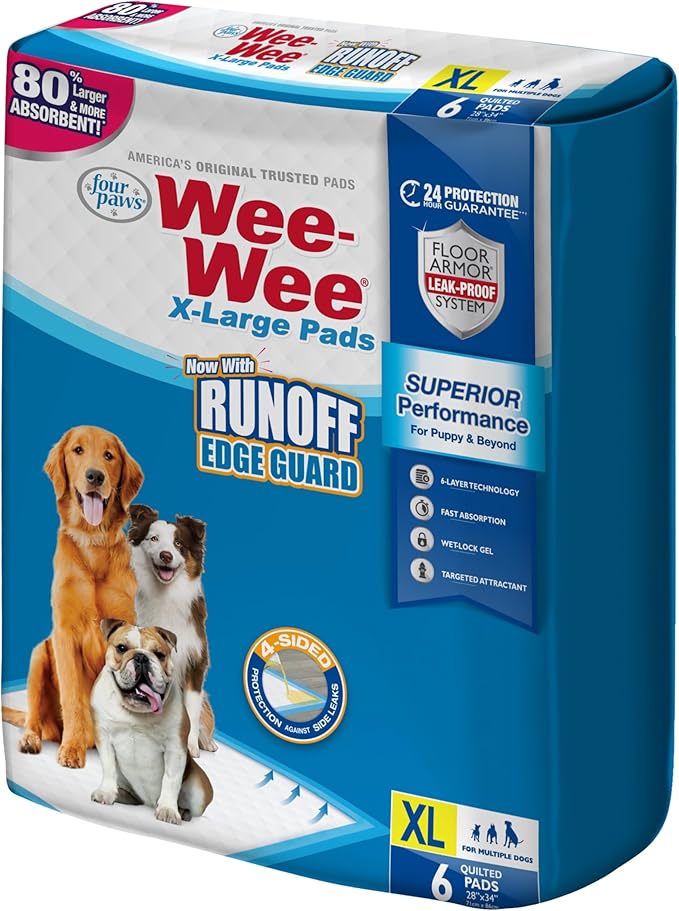 Four Paws Wee-Wee Superior Performance Pee Pads for Dogs with Runoff Barrier Edge Guard Protection, Puppy & Dog Potty Training Pads, Housebreaking Supplies, 28" x 34" (6 Count)