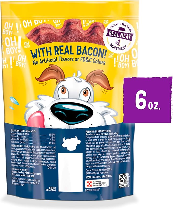 About This Real meat is the number 1 ingredient in these bacon and beef treats for dogs. Purina bacon strip... Read more