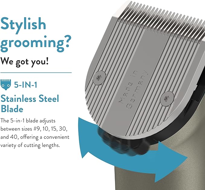 - The 5-in-1 fine blade adjusts between sizes #9, 10, 15, 30, and 40, offering a convenient variety of cutting lengths; With a rechargeable battery, this clipper has an 80-minute cordless run time and 75 minute charge time