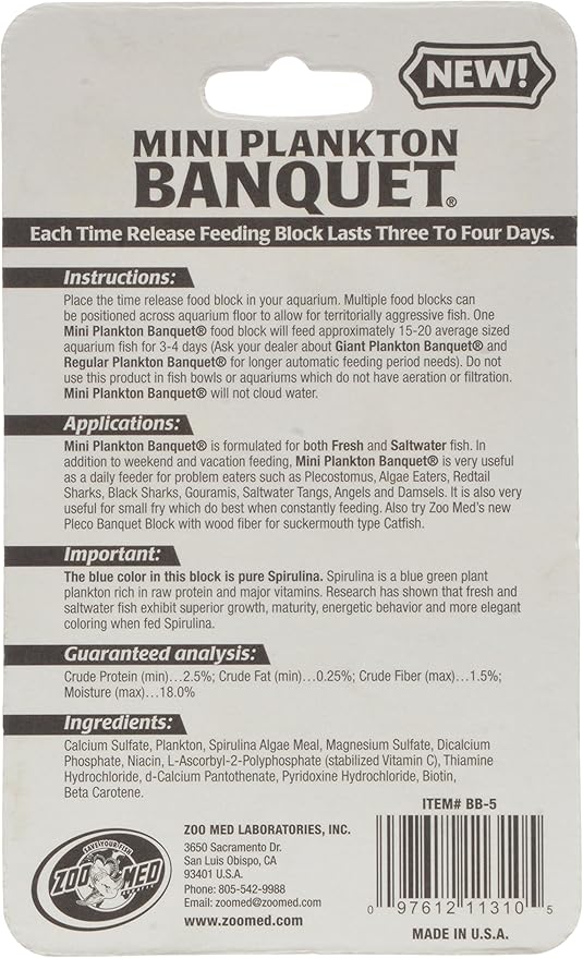 About This Great for bottom feeders Lasts 3-4 days For fresh and saltwater Zoo Med Laboratories plankton Banquet Block Feeder... Read more