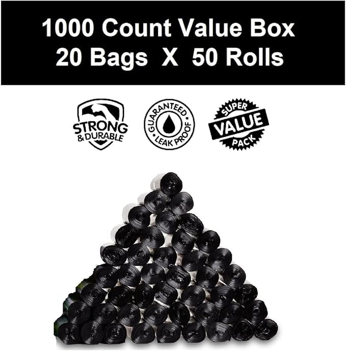 About This 1000 Bags Per Case 50 Rolls, 20 Bags Per Roll, Color Black Leak Proof, One Hand Self Tear... Read more