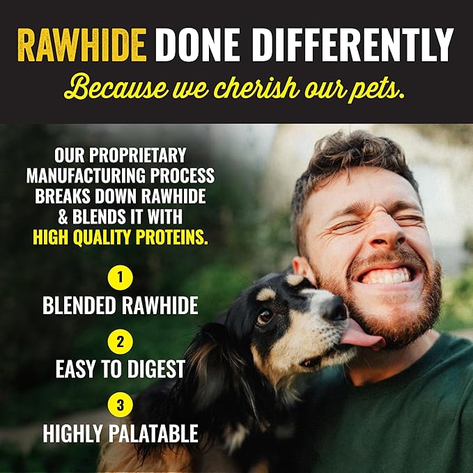 - Blended Rawhide – Our proprietary manufacturing process breaks down rawhide and blends it with protein.