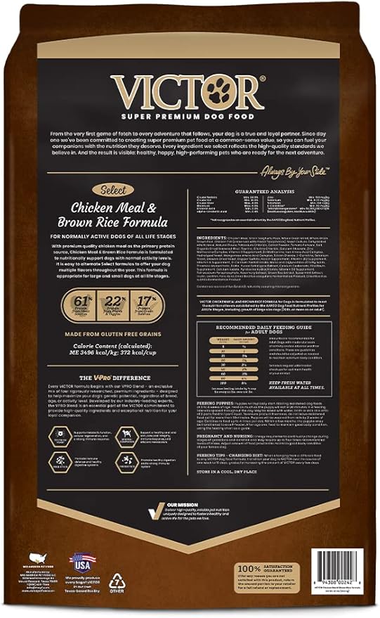 - CHICKEN MEAL & BROWN RICE: VICTOR Chicken Meal & Brown Rice Formula super premium dog food is formulated for normally active dogs and is ideal for dogs with allergies to other proteins; packed with 24% protein and 12% fat, this dry dog food promotes optimal nutrition for energy and growth for your furry friend
