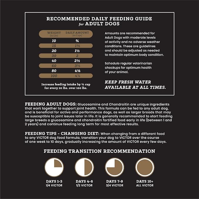 - HIP & JOINT HEALTH: VICTOR Performance dog food is designed with added glucosamine and chondroitin to support hip and joint health in active adult dogs, helping promote mobility and comfort for adult dog maintenance