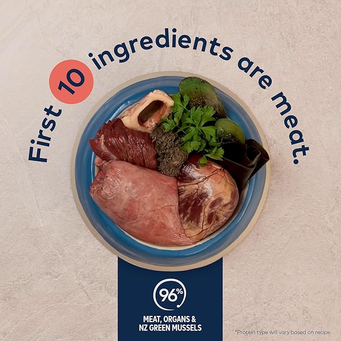 - HIGH PROTEIN, NUTRIENT DENSE: Featuring free-range Beef, Organs, Bone, and New Zealand Green Mussels, this grain-free dog food delivers nutrition with a mouth-watering taste for all dogs. Gentle air dried processing retains the goodness of the raw ingredients. This food offers stimulating crunchy texture small enough for puppy food but soft enough for senior dog food.