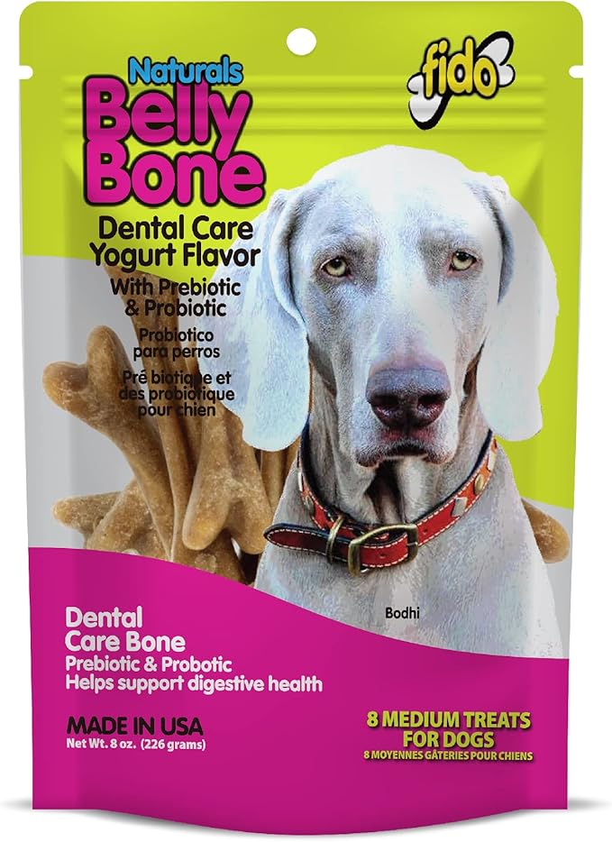 Fido - Belly Bones for Dogs, 8 Yogurt Flavor Medium Dog Dental Treats (Made in USA) - 8 Count Dog Treats for Medium Dogs - Plaque and Tartar Control for Fresh Breath, Digestive Health Support