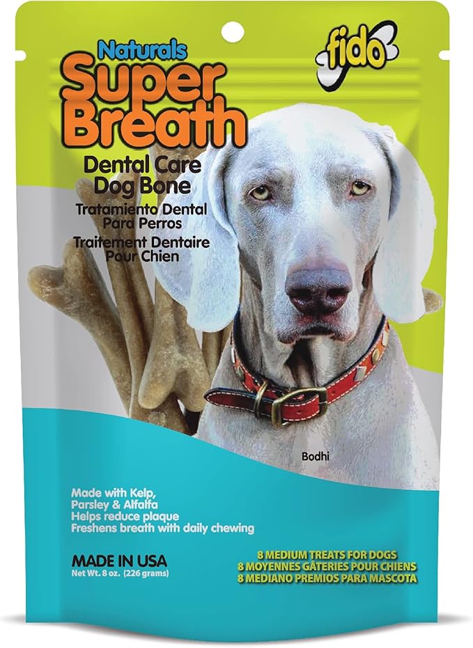 Fido - Super Breath Dental Care Bones for Dogs - 8 Count Medium Dog Dental Treats for Medium Dogs (Made in USA) - Tasty Dog Dental Chews Help Reduce Plaque, Tartar Buildup, and Freshens Breath