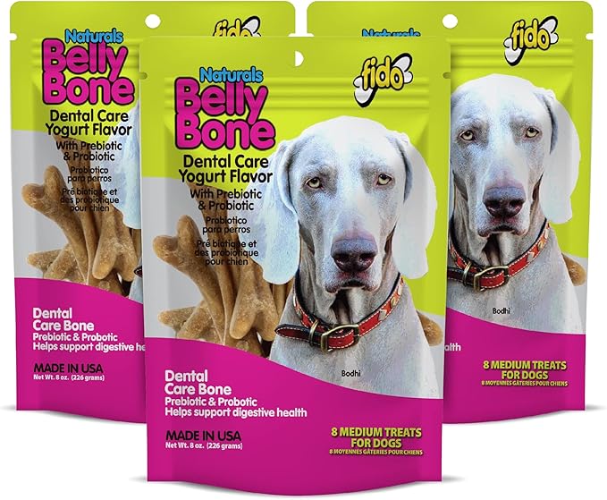 Fido - Belly Bones for Dogs, Yogurt Flavored Medium Dog Dental Treats - 8 Treats Per Pack (3 Pack) - (Made in USA) - Plaque and Tartar Control for Fresh Breath, Digestive Health Support