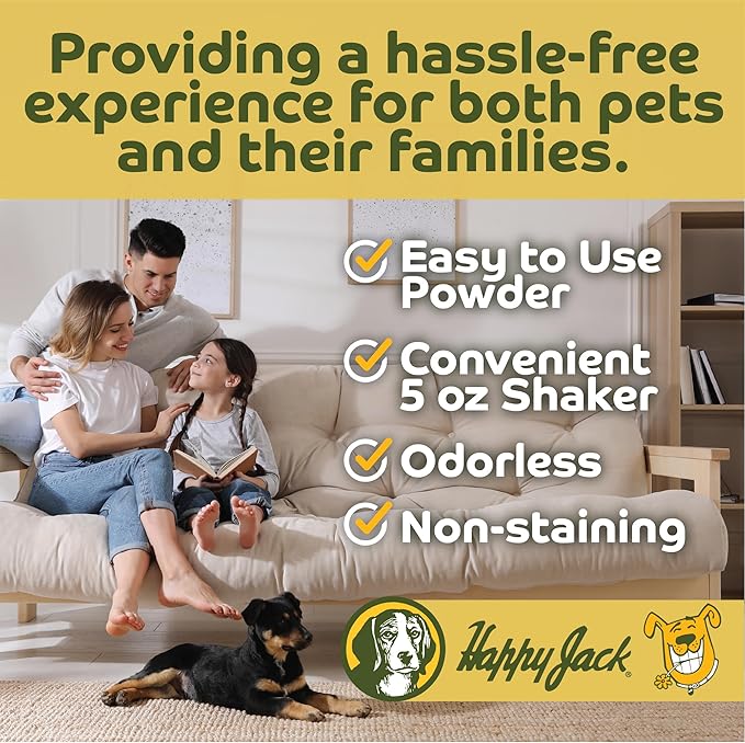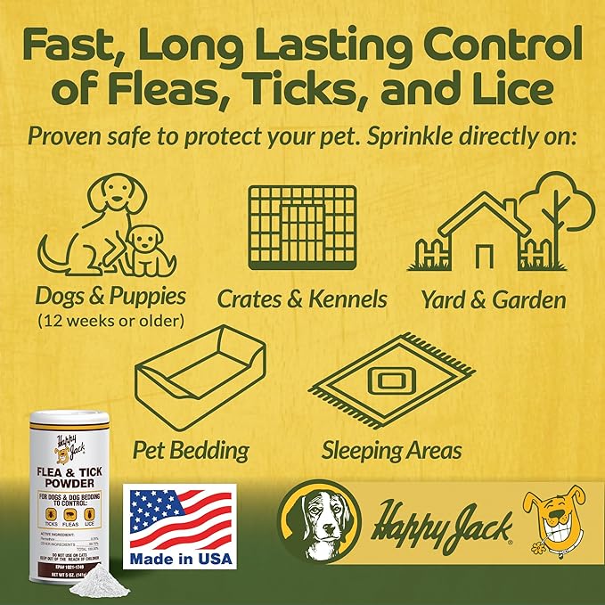 Happy Jack Flea and Tick Powder for Dogs & Puppies, Flea Powder for Flea Treatment & Control, Kills Pests, Ticks & Lice, Odorless & Non-Staining, Dust on Sleeping Quarters & Dogs (5 oz)