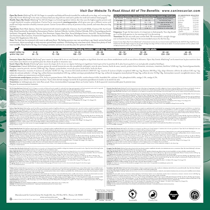 Canine Caviar - Open Sky: Duck & Teff Alkaline Dry Dog Food, Limited Ingredients, Gluten-Free, Based on Science & Research, Veterinary Alternative Diet (11 Pound Bag)