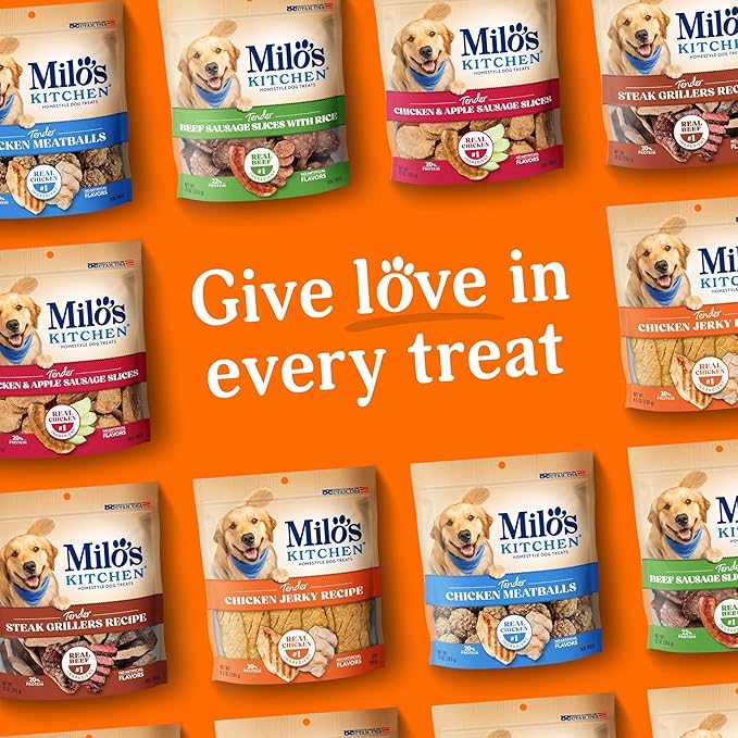 - Contains one (1) 8.5-oz. bag of Milo’s Kitchen Chicken Jerky Recipe dog treats