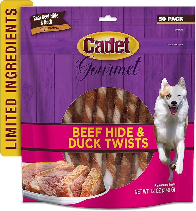 Cadet Gourmet Beef Hide Twist Chew Sticks, Long Lasting & Natural Chew Treats for Dogs, Inspected & Tested in USA, Duck Flavor (50 Count)