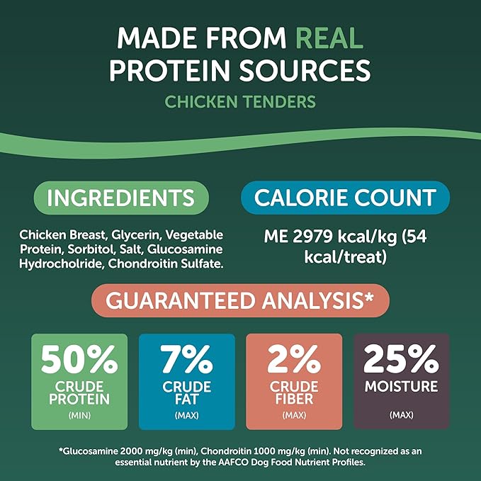- CHICKEN DOG TREATS - Made with natural chicken breast as the first ingredient, these treats are high in protein, low in fat, and are easily digestible for dogs of all sizes. The Glucosamine and Chondroitin help to promote strong joints, and amino acids help to support their muscle development and tone, which is especially important in growing puppies and senior dogs.