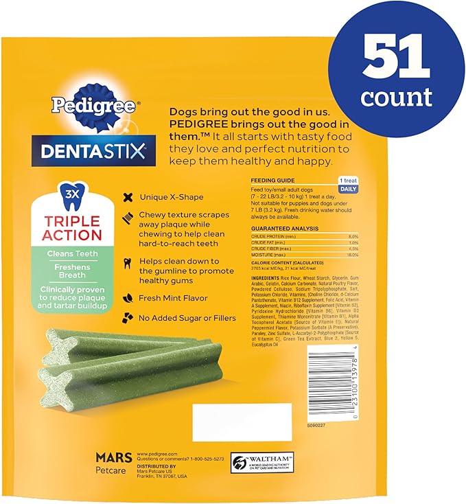 - Triple Action: Pedigree Dentastix Small and Toy Breed Dental Care Treats come with triple action which reduces tartar buildup, cleans teeth, and freshens breath