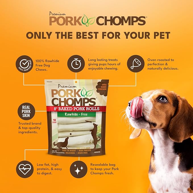 Pork Chomps Baked Pork Skin Dog Chews, 8-inch Rolls, 18 Count (Pack of 1)