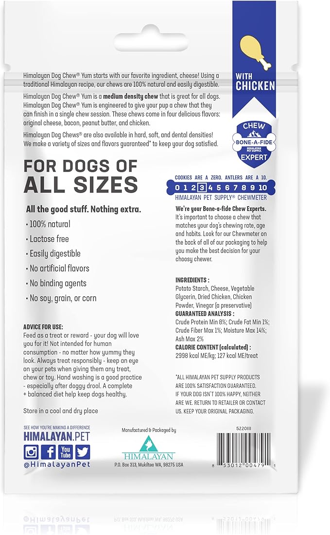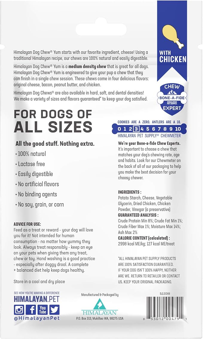 Himalayan Dog Chew Yak Cheese Dog Chews, Lactose Free & Grain Free, USA Made, for All Dog Breeds, Medium Density Cheese Chew, Resealable Pouch with 3 YUM Treats, Chicken Flavor