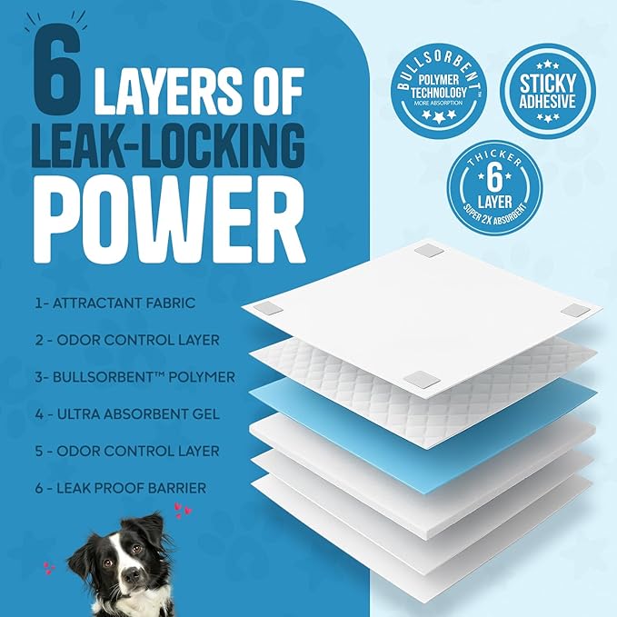 About This 6 LAYER ABSORBENT: 50 Count Large 24x24 inch Puppy Pee Pads with new Bullsorbent Polymer Tech that instantly... Read more