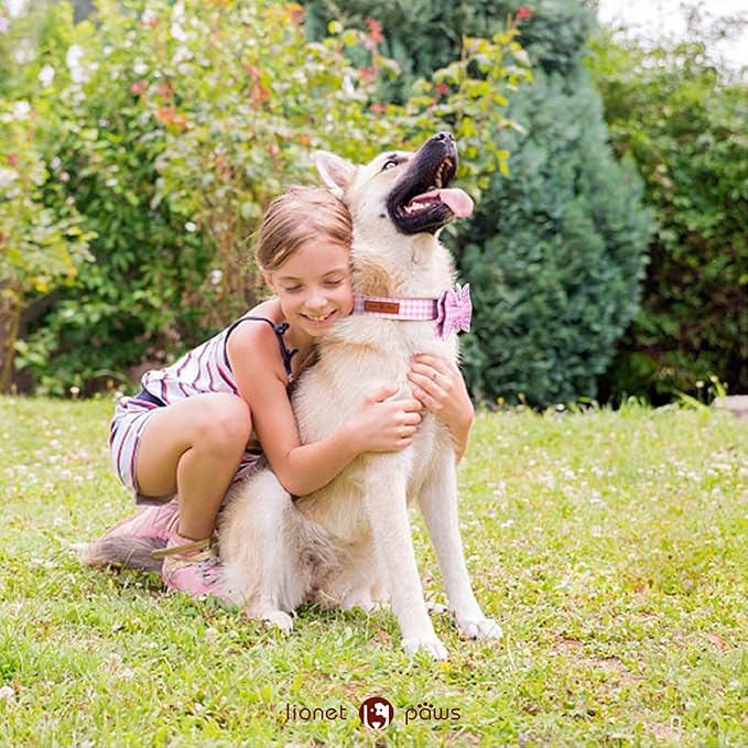 Lionet Paws Dog Collar with Bowtie, Comfortable Adjustable Cute Pink Gingham Bow Tie Collar for Female Dogs Gift, Large, Neck 16-24 inches