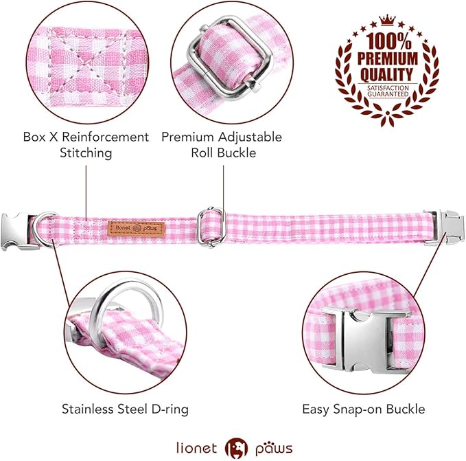 Lionet Paws Dog Collar with Bowtie, Comfortable Adjustable Cute Pink Gingham Bow Tie Collar for Female Dogs Gift, XLarge, Neck 16-26 inches
