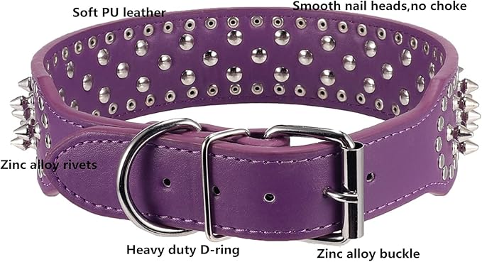 Hoot PU Leather Adjustable Spiked Studded Dog Collar 2" Wide 31 Spikes 52 Studs (S(Neck 17"-20"), Purple)