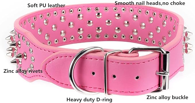 Hoot PU Leather Adjustable Spiked Studded Dog Collar 2" Wide 37 Spikes (M(Neck 19"-22"), Rose Red)