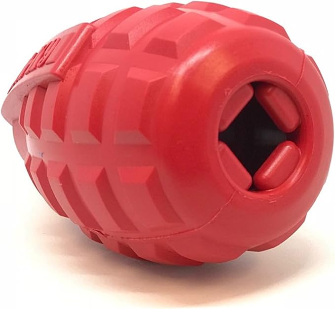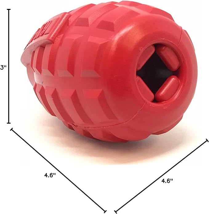• FUN TREAT DISPENSER & CHEW TOY – This durable, rubber grenade-shaped dog toy is “lit”, because it functions as both a chew toy & treat dispenser. Fill it with your dog’s favorite wet or dry food, or both and freeze to prolong use. Large 4.6” x 3”.