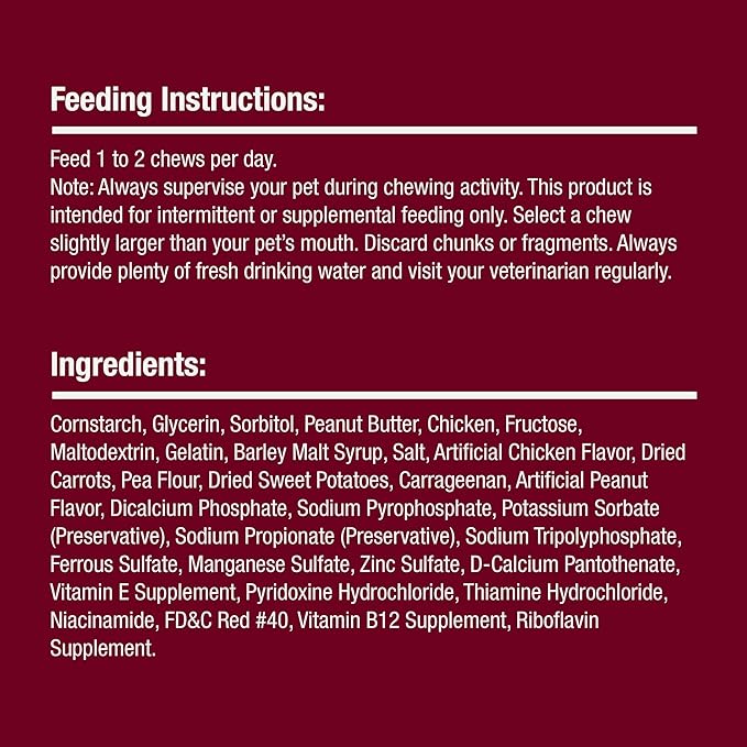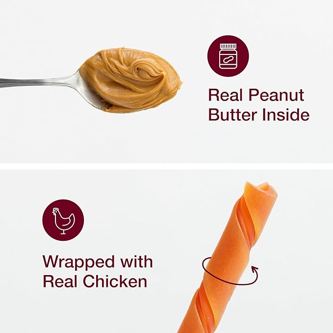 About This RAWHIDE-FREE: Easy-to-digest dog chews made with wholesome ingredients. REAL PEANUT BUTTER: Made with peanut butter, chicken and vegetables... Read more