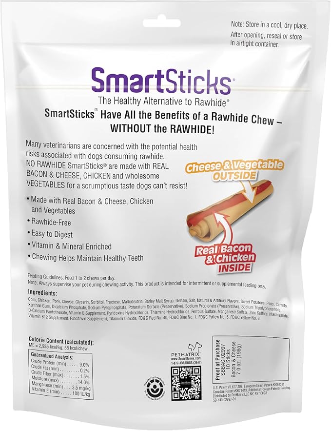SmartBones SmartSticks, Treat Your Dog to a Rawhide-Free Chew Made With Real Bacon and Cheese, 10 count (24 pack)
