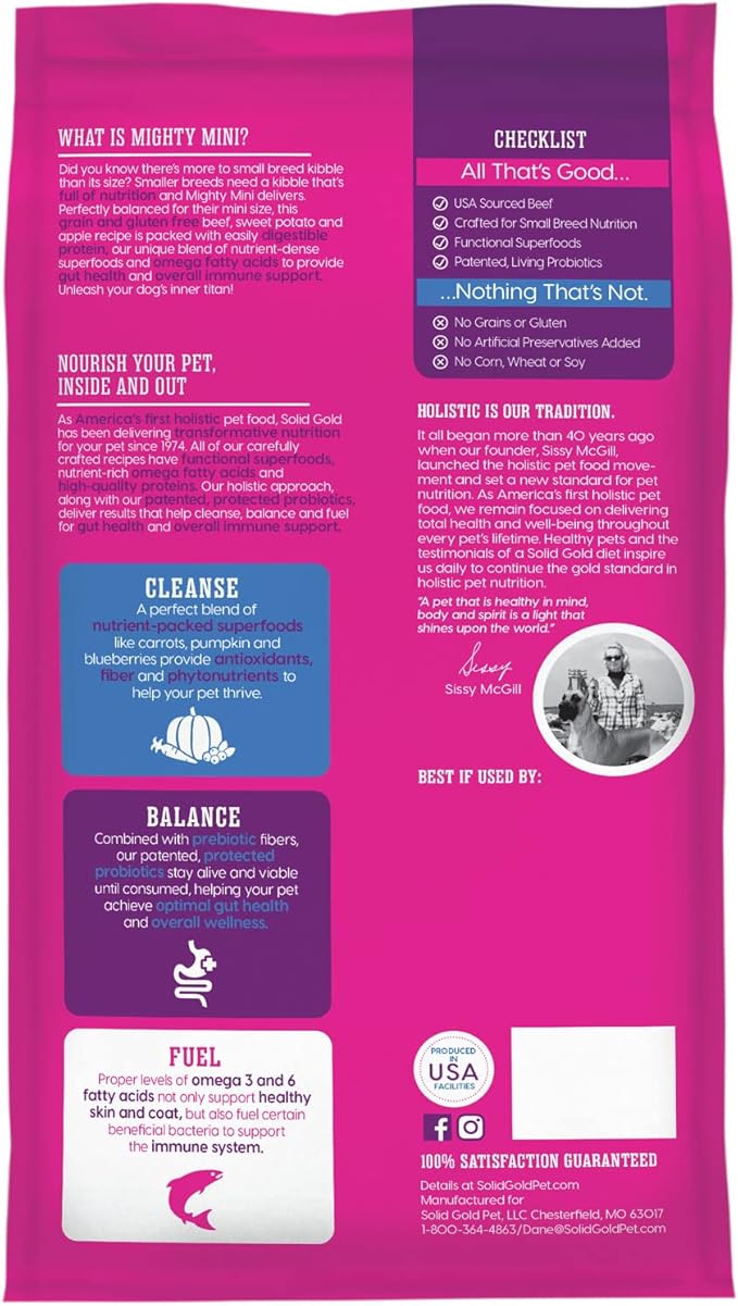 Solid Gold Toy & Small Breed Dry Dog Food Small Bites – Real Beef, Grain Free, Gluten Free, High Fiber Kibble with Probiotics for Gut Health & Digestion Support – Healthy Dog Food All Ages – 4LB