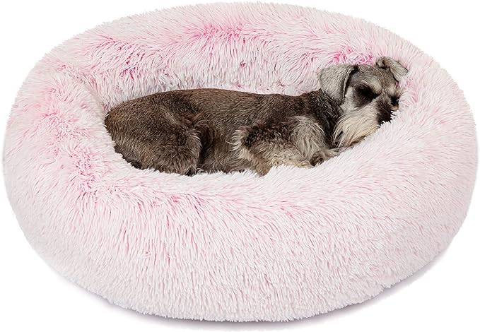 Friends Forever Donut Dog Bed Faux Fur Fluffy Calming Sofa For Medium Dogs, Soft & Plush Anti Anxiety Pet Couch For Dogs, Machine Washable Coco Pet Bed with Non-Slip Bottom, 30"x30"x7" Pink
