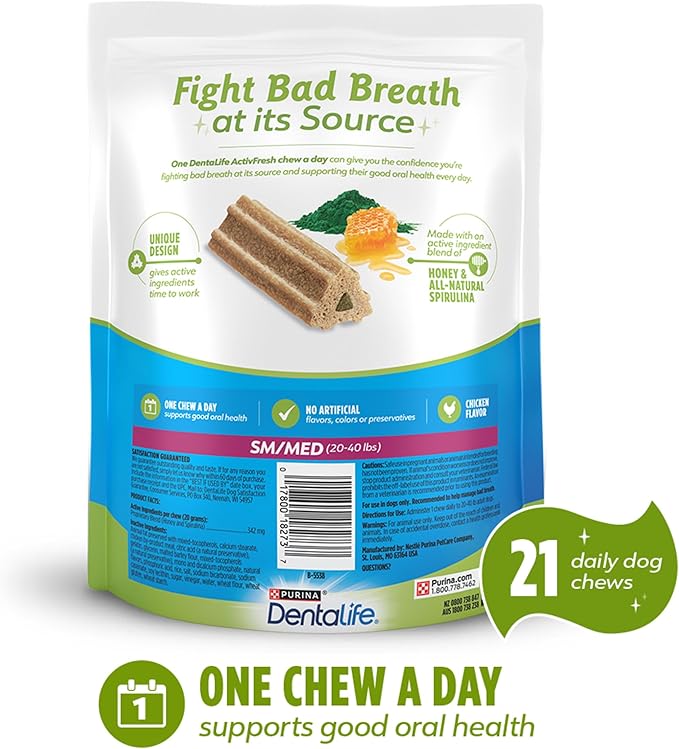 About This 15.5-ounce resealable pack of DentaLife ActivFresh Dog Chews includes 21 chicken-flavored dog chews for small and medium dogs... Read more
