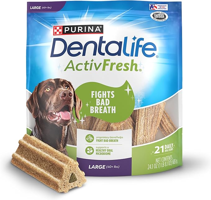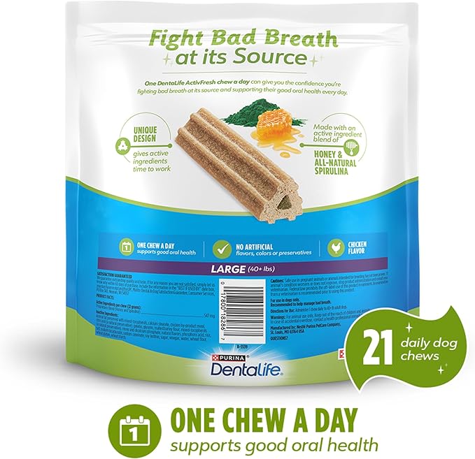 About This 24.1-ounce resealable pack of DentaLife ActivFresh Dog Chews includes 21chicken-flavored dog chews for large dogs 40 pounds and... Read more