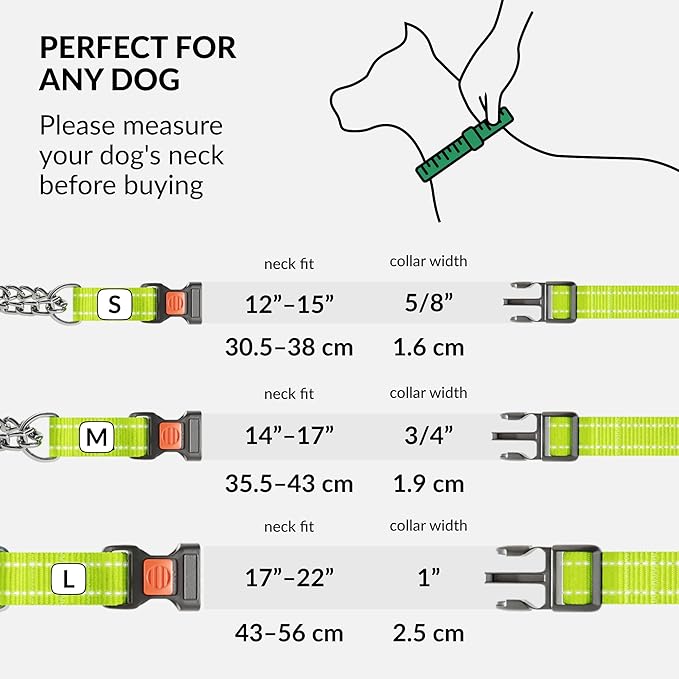 CollarDirect Martingale Dog Collar with Stainless Steel Chain and Quick Release Buckle - Reflective Collar for Large, Medium, Small Dogs - Lime Green, Medium (Neck Size 14"-17")