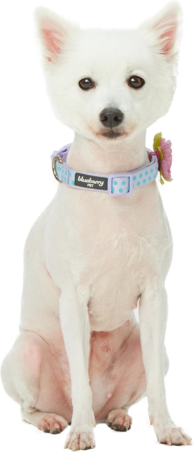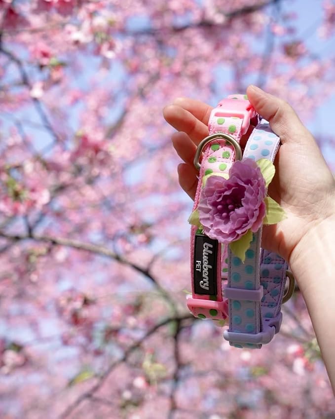 Blueberry Pet Adjustable Flocking Dog Collar with Artificial Silk Flower - Polka Dot in Pastel Purple, Large, Neck 18"-26"