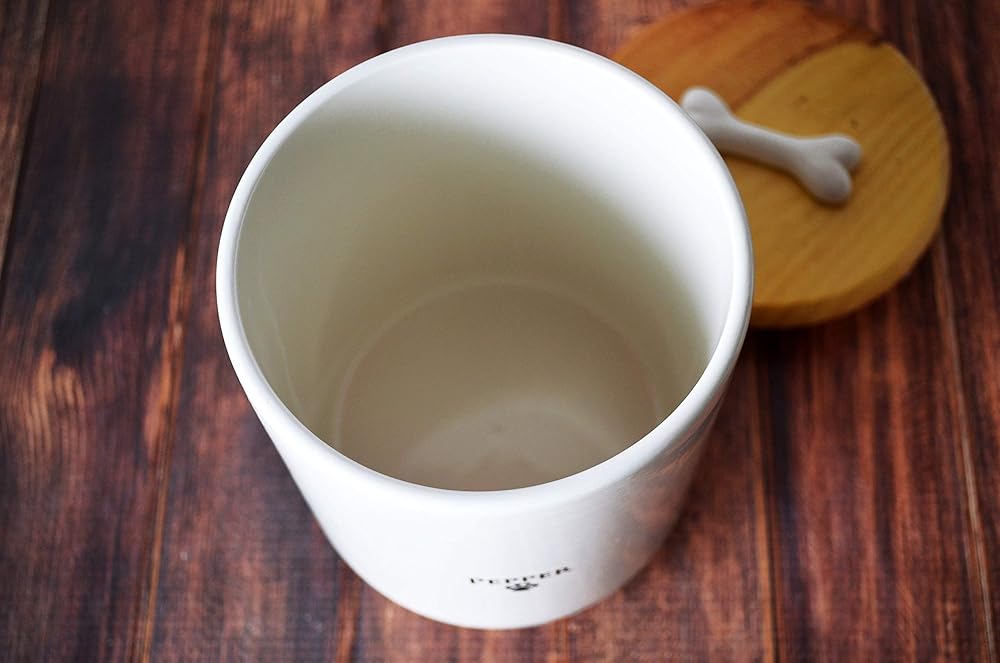 - The lid has a rubber seal to make it air-tight and measures 6 1/8" H x 5 1/8" Dia and can hold up to 36 ounces. The lid comes with a dog bone tile on top.