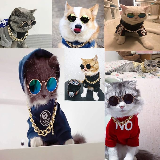 Legendog , 2pcs Fashion Cool Pet Sunglasses Adjustable Pet gold chain Set for Cats and Small Dogs