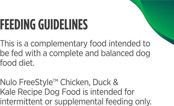 - CHICKEN, DUCK, & KALE RECIPE - Nulo Freestyle Puppy & Dog Wet Food Toppers have no grains, artificial flavors, or preservatives. These real meat dog toppers feature natural animal-based protein and only 3 wholesome ingredients in each pouch. Pack of 6, 2.8 Oz each.