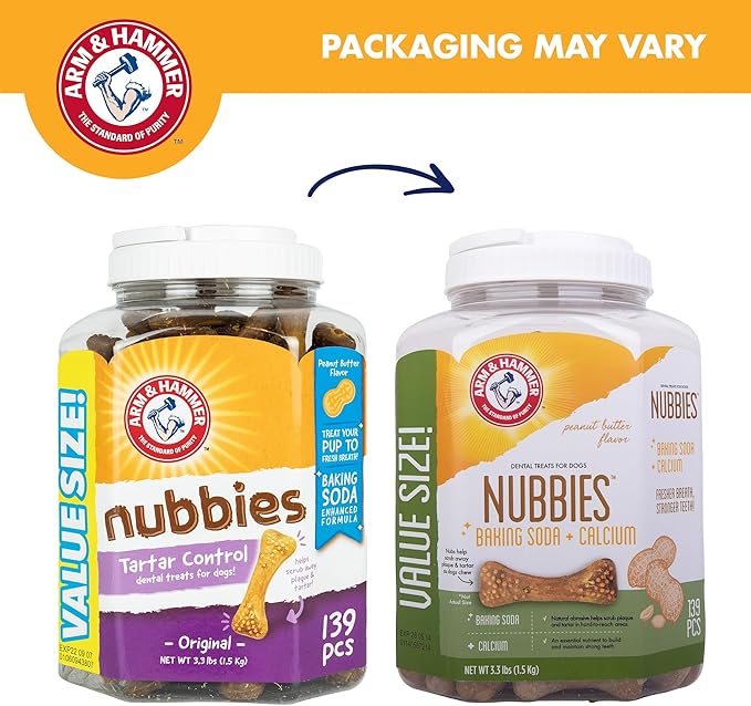 Arm & Hammer for Pets Nubbies Dental Treats for Dogs with Baking Soda and Calcium, Treat Chews Help Fight Bad Breath, Plaque & Tartar, Peanut Butter, Value Bucket, 139 Pcs (Packaging may vary)