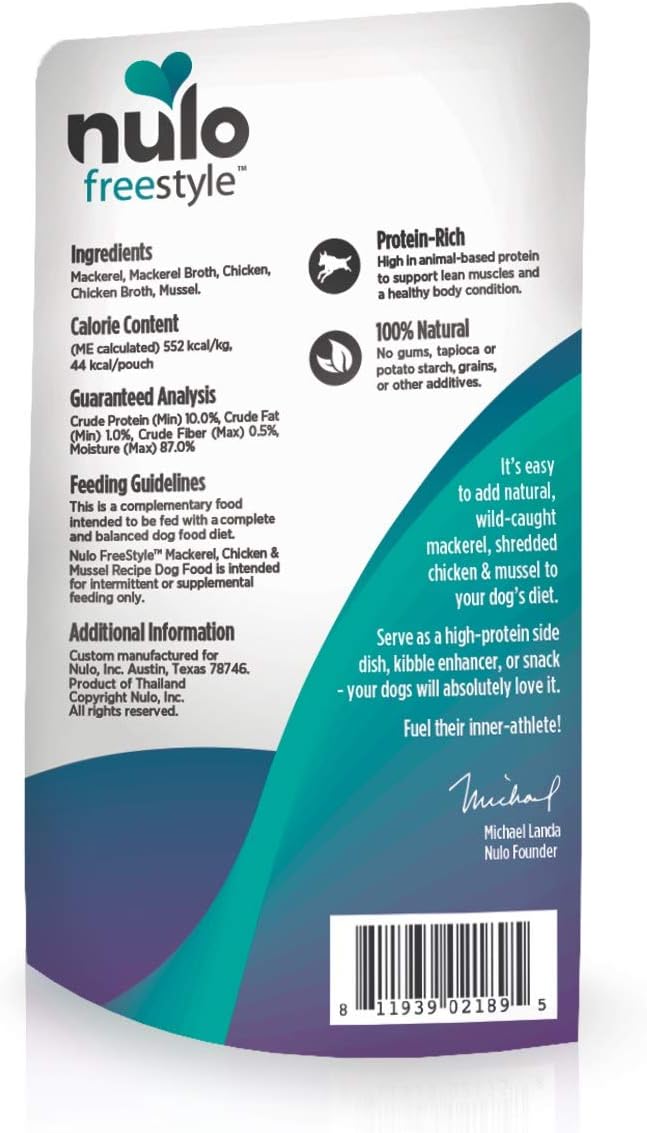 - MACKEREL, CHICKEN, & MUSSEL RECIPE - Nulo Freestyle Puppy & Dog Wet Food Toppers have no grains, artificial flavors, or preservatives. These real meat dog toppers feature natural animal-based protein and only 3 wholesome ingredients in each pouch. Pack of 6, 2.8 Oz each.