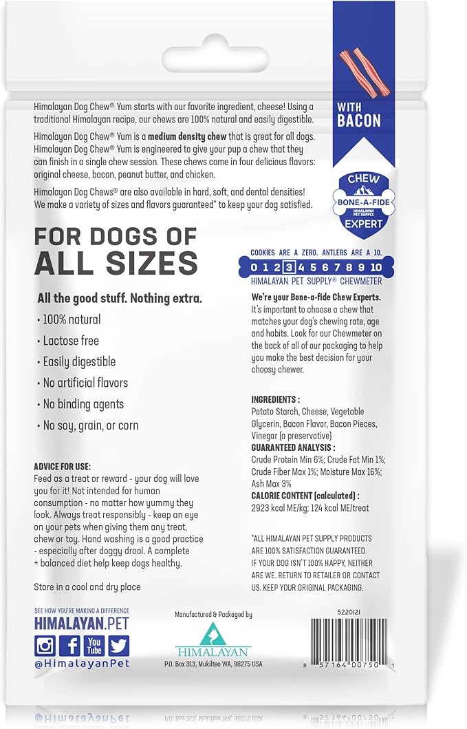 Himalayan Dog Chew Yak Cheese Dog Chews, Lactose Free & Grain Free, USA Made, For All Dog Breeds, Medium Density Cheese Chew, Resealable Pouch with 3 YUM Treats, Bacon Flavor