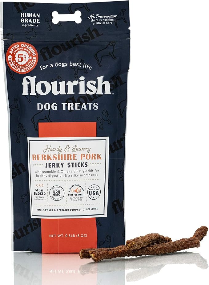 Flourish Pets Berkshire Pork Jerky/Meat Sticks, Dog Treats, Healthy Pet Training Chews (8 Ounces)