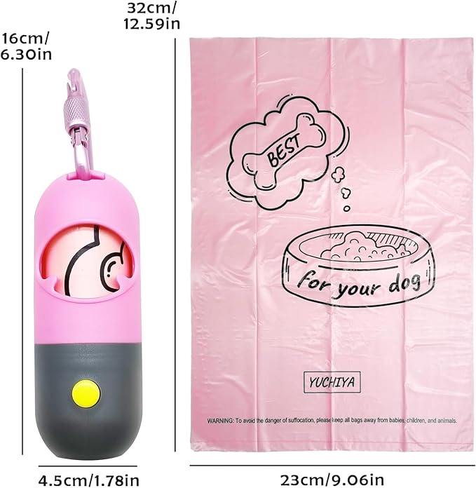 Dog Poop Bags Holder with LED Flashlight|Pet Waste Bags Dispenser for Leash|Doggie Potty Bags Container with Leak-proof Pet Trash Bags and Accessories (1 Holder 15 Bags, Pink)