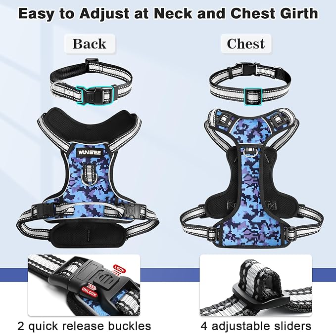 WINSEE Dog Harness No Pull, Pet Harnesses with Dog Collar, Adjustable Reflective Oxford Outdoor Vest, Front/Back Leash Clips for Small, Medium, Large, Extra Large Dogs, Easy Control Handle for Walking