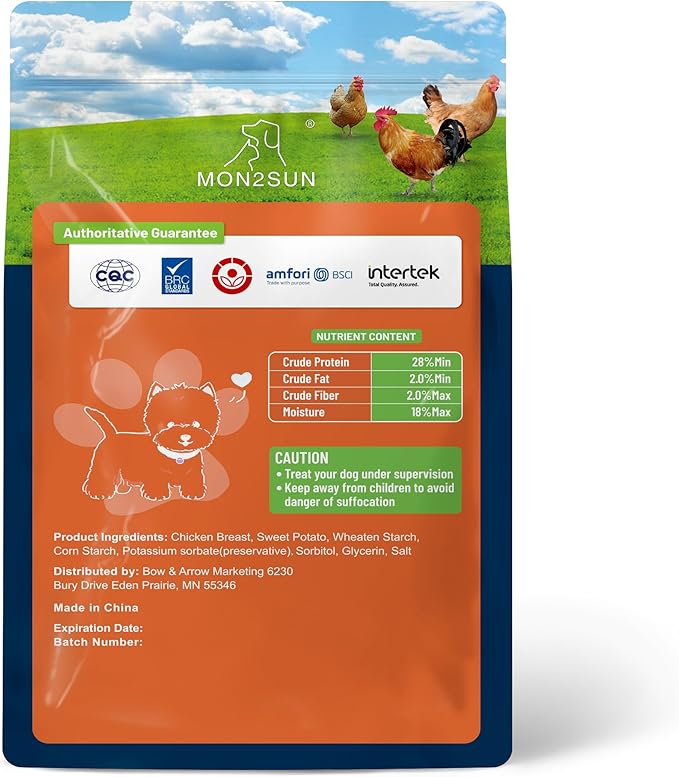- [Safe Ingredients] MON2SUN dog treats are majorly made of chicken and sweet potato. Each ingredient undergoes rigorous inspection to ensure the utmost safety for your furry family member.