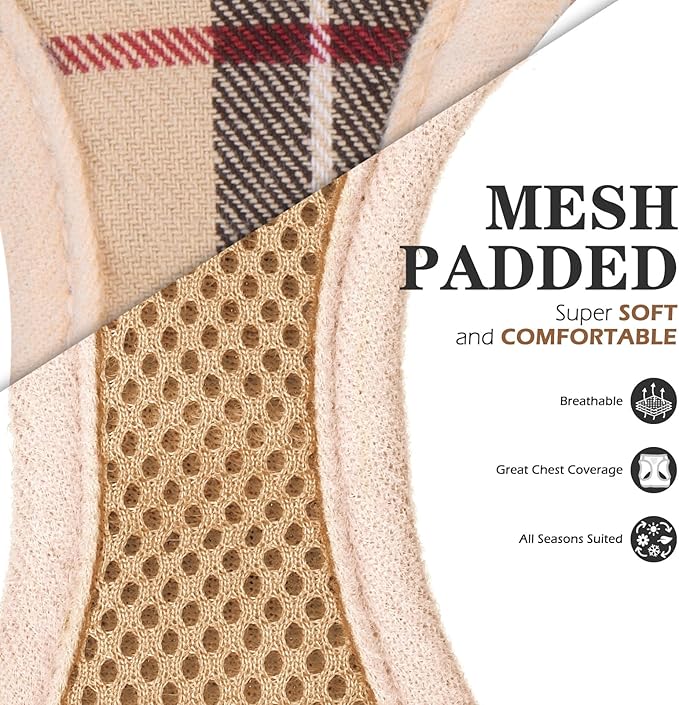 EXPAWLORER Plaid Small Dog Harness and Leash Set with AirTag Holder - Soft Padded Step in Dog Vest Harness Medium Sized Dog, No Pull Reflective Puppy Harness, Collar and Leash for Walking, Khaki S