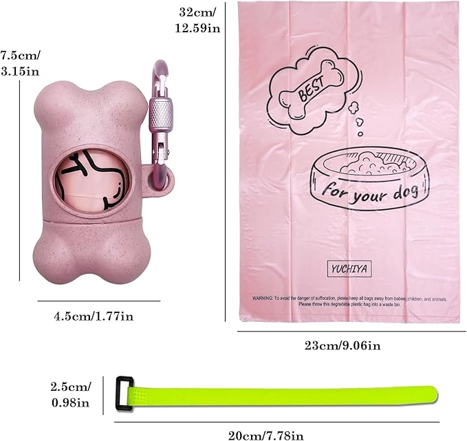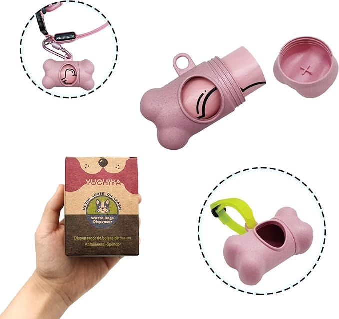 Dog Poop Pickup Bags Holder Dispenser with 1 Roll Random Color Leak-proof Scented Doggy Waste Bags and Carabiner with Safety Lock Plus Hook and Loop Fastener Never Loose on Leash Lead Again (Pink)