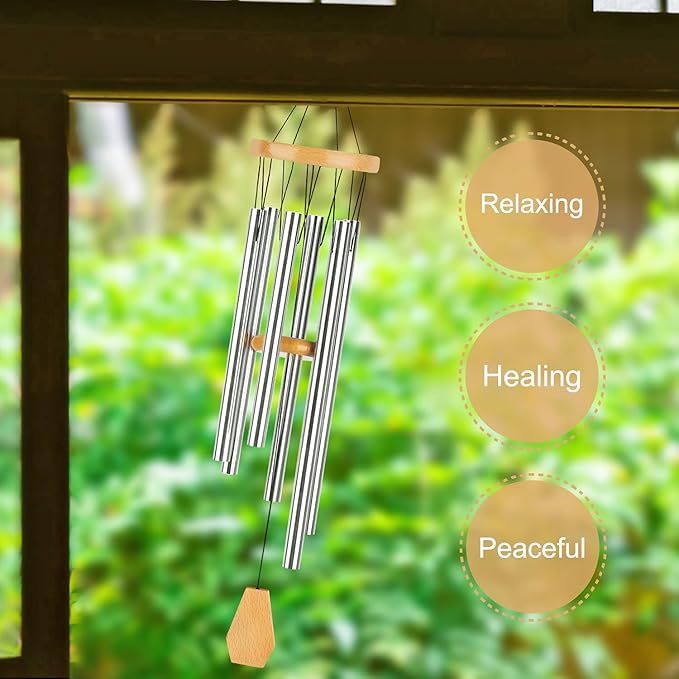 - Large Wind Chimes - Total hanging overall length is 32.5”. The outdoor wind chimes is made of 6 tubes of different length in silver finish, each metal tube has its own unique tone and creates a longer lasting deep tone.