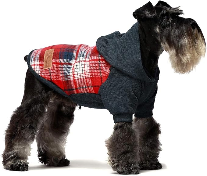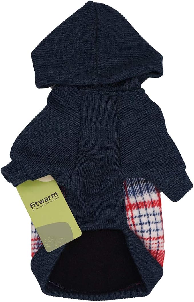 Fitwarm Tartan Plaid Dog Hoodie, Knitted Dog Clothes for Small Dogs Boy, Pet Sweater with Hood, Cat Fleece Lined Winter Outfit, Red, Navy Blue, XXL