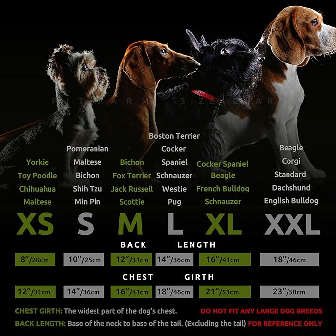 About This DO NOT FIT ANY MEDIUM OR LARGE DOG BREEDS!! Size XL, fits 16" back, 21" chest. Recommended for... Read more